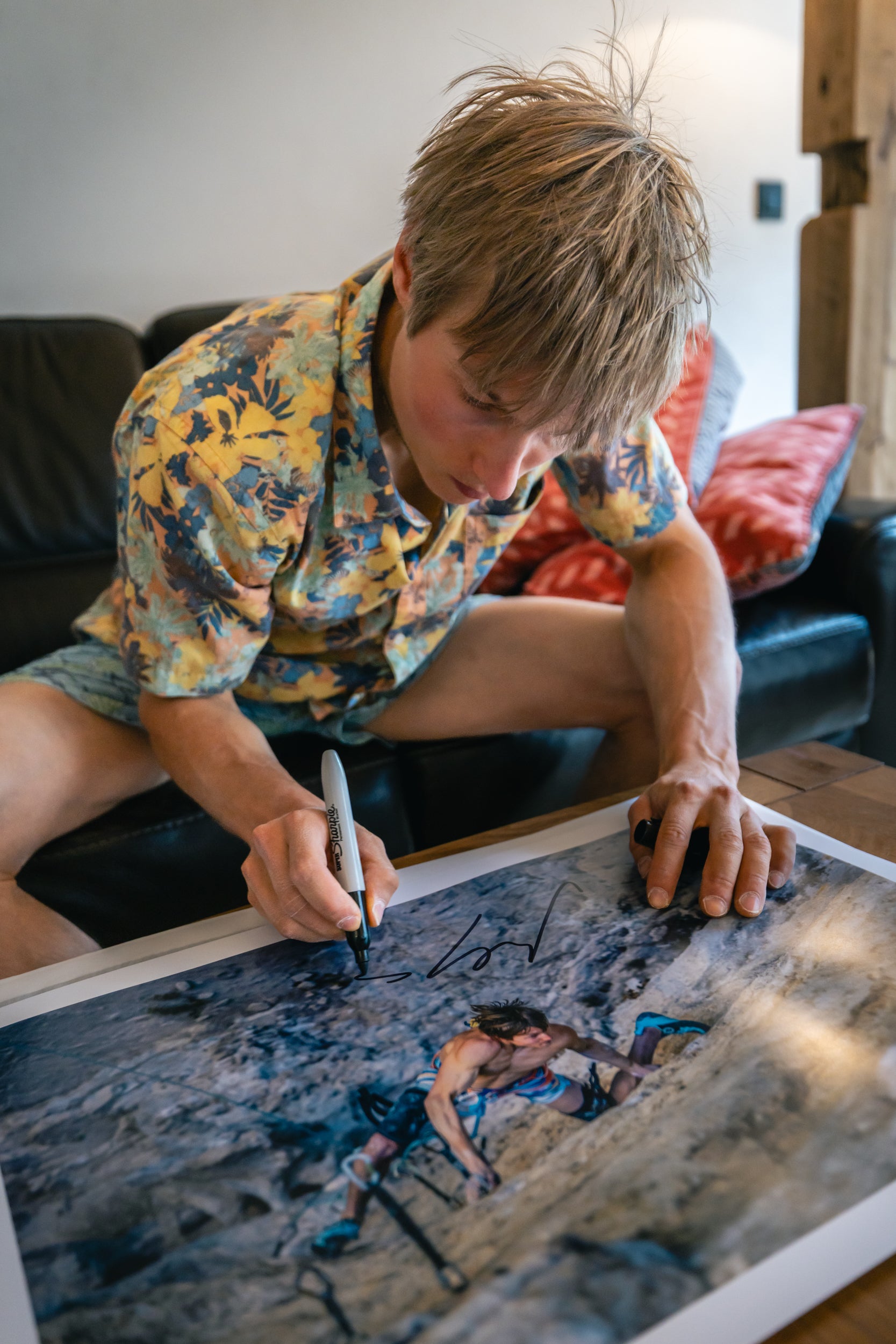 Signed Print of Alexander Megos making first ascent of Le Grand Saccage 9a+/b in Buoux, France.