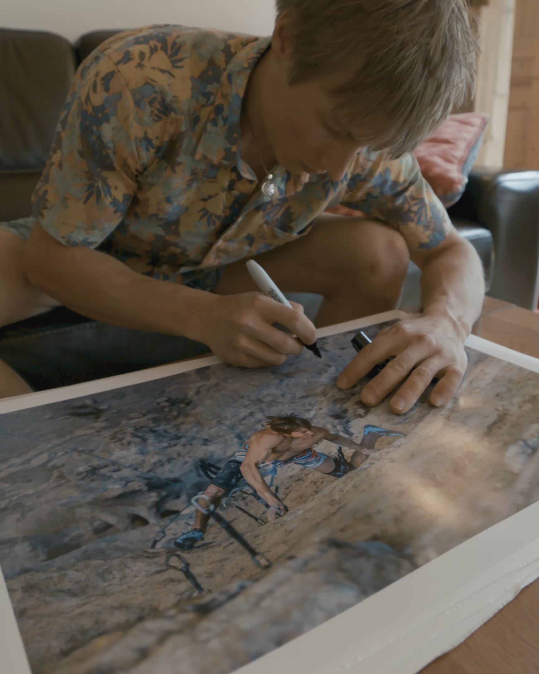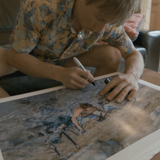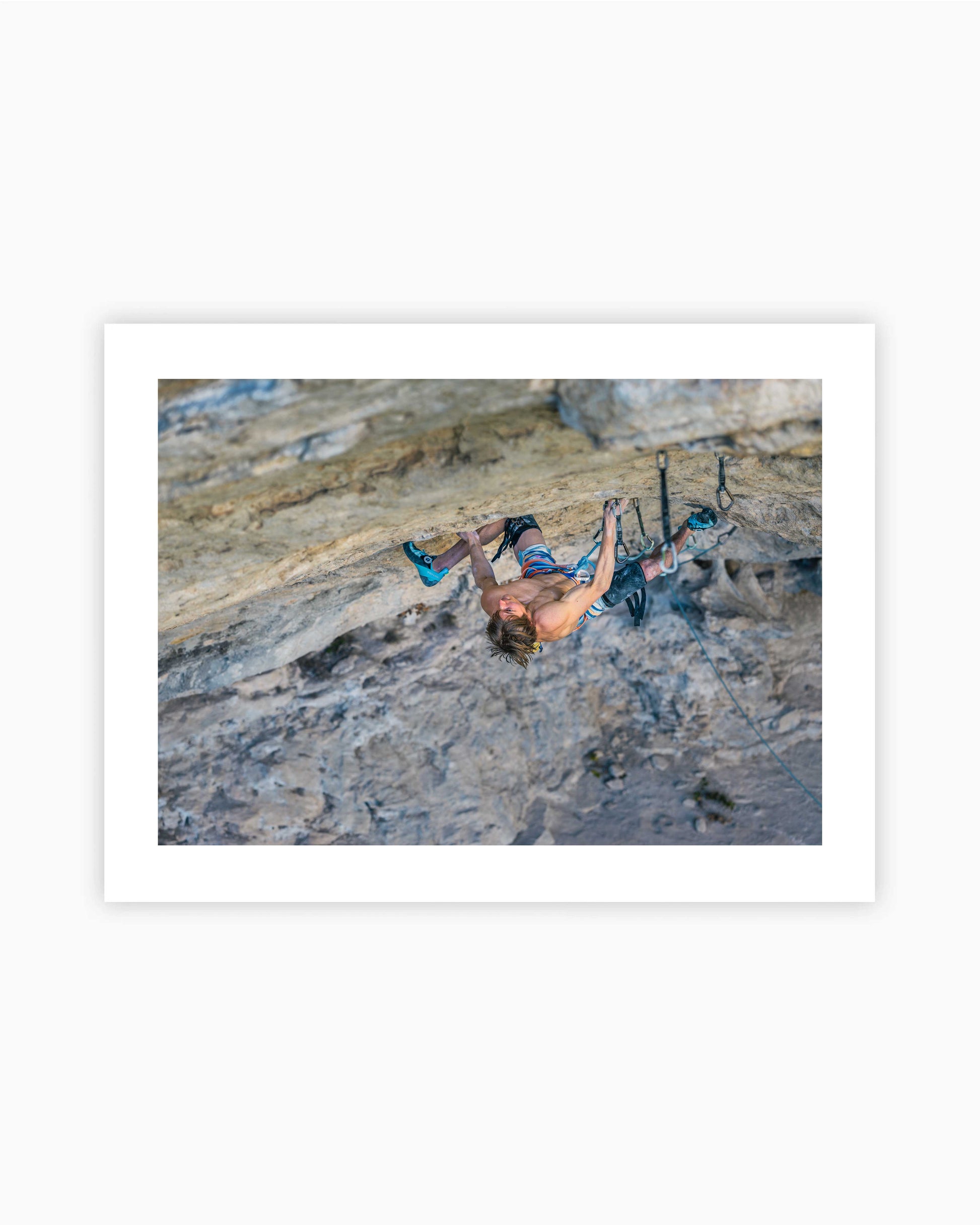 Limited edition of 50 signed prints by Alex Megos. 40cm x 60cm | 16in x 24in printed on high quality, mat photo paper 240gsm. 2.5cm | 1in white margin around all edges to facilitate framing.